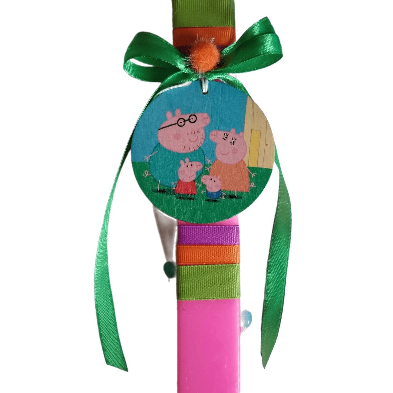 Πλακέ ροζ λαμπάδα της αγαπημένης σας Peppa με ξύλινο διακοσμητικό κρεμαστό.